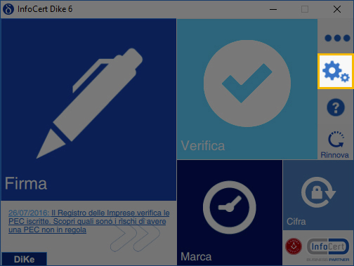 1. Apri il Software DiKe 6 e Accedi a Configurazione facendo click sul pulsante con i due ingranaggi e poi dal menu laterale seleziona la voce marcatura temporale.