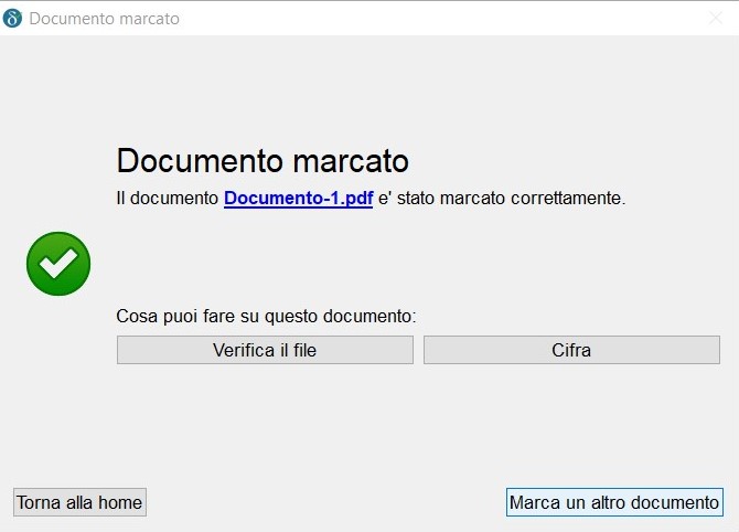6. Fai click sul pulsante Marca per avviare il processo di marcatura. Al termine del processo di apposizione avrai una conferma della corretta marcatura del documento.