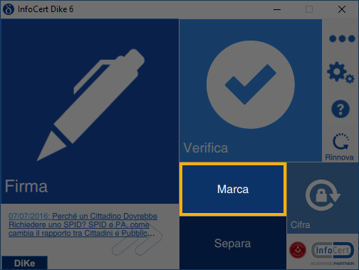 3. Dall’interfaccia principale del software DiKe Go Sign seleziona il riquadro Marca e poi di nuovo la voce Marca.