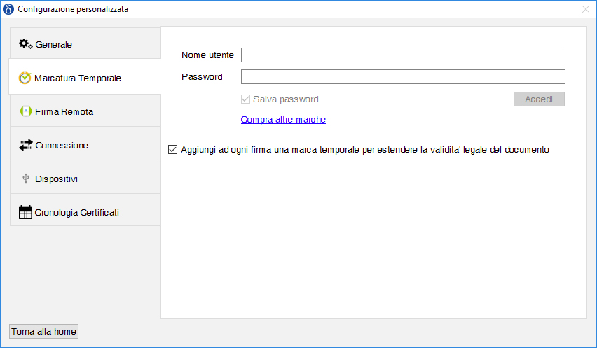 1. Apri il Software DiKe Go Sign e Accedi a Configurazione facendo click sul pulsante con i tre ingranaggi e poi dal menu laterale seleziona la voce marcatura temporale.