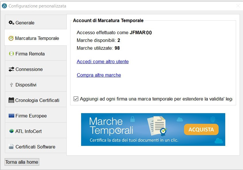 Il Software DiKe esegue un controllo e associa le tue Marche Temporali al software DiKe Go Sign indicando anche il numero di marche che hai a disposizione.